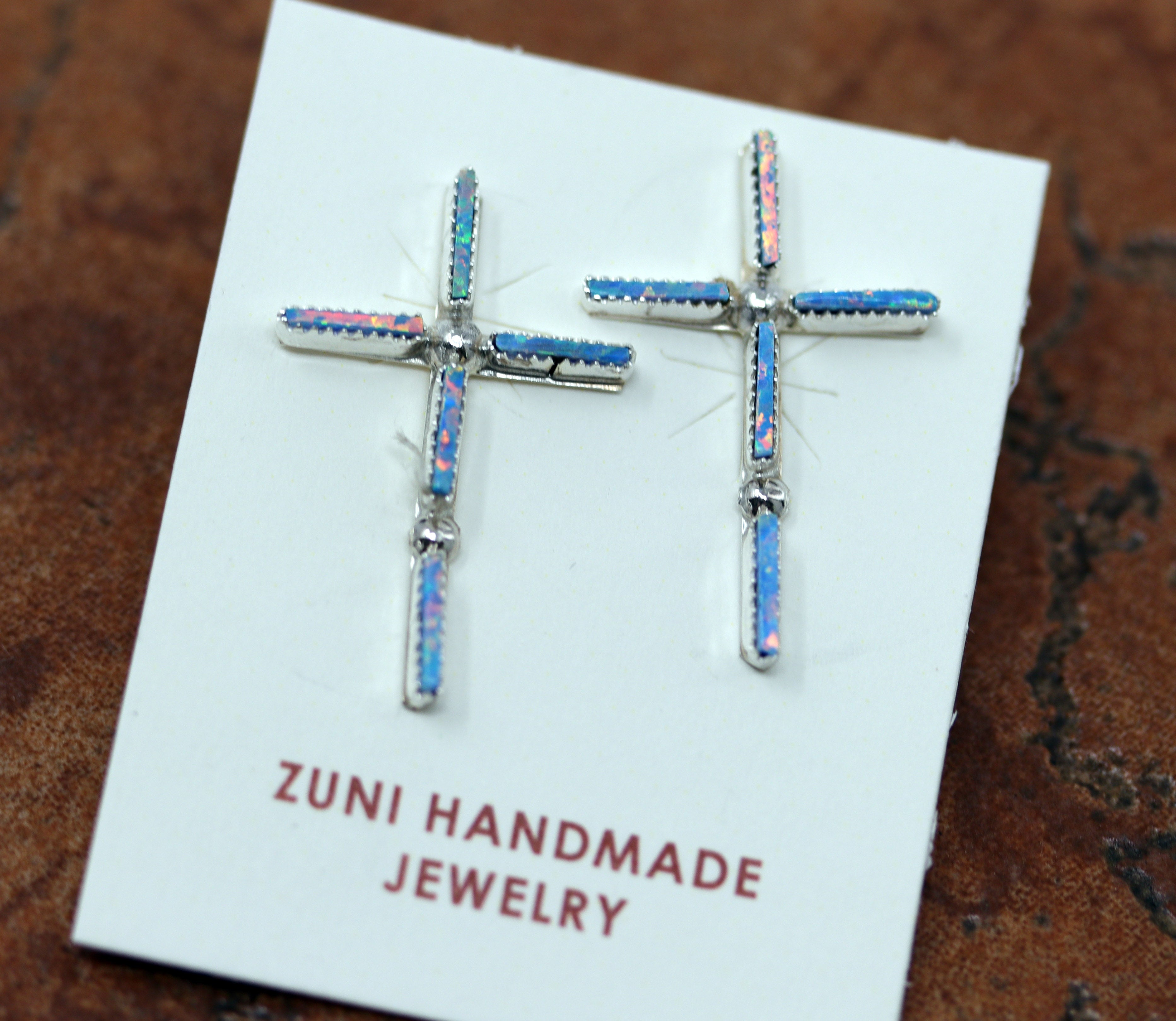 Beautiful Zuni Native American Cross earrings. They are made from sterling silver and created opal. Each earring is 1 1/8" in length, and about 3/4" in width.