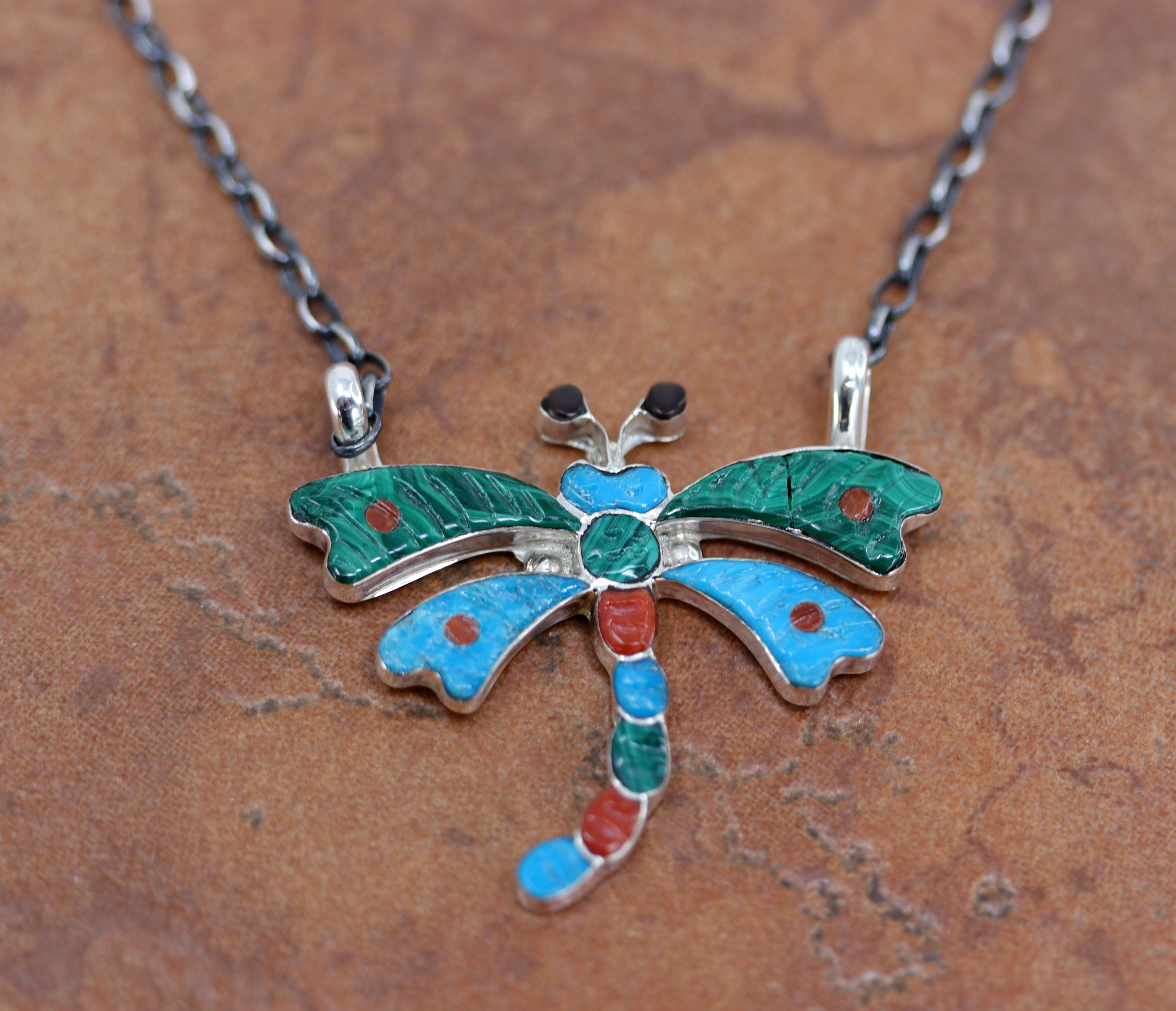 Beautiful Zuni Native American necklace by Tamara Pinto made from sterling silver and a multi stone inlay. The necklace is 17 1/2" in length and the width of the pendant is 1 1/2" long. It is signed by the artist.