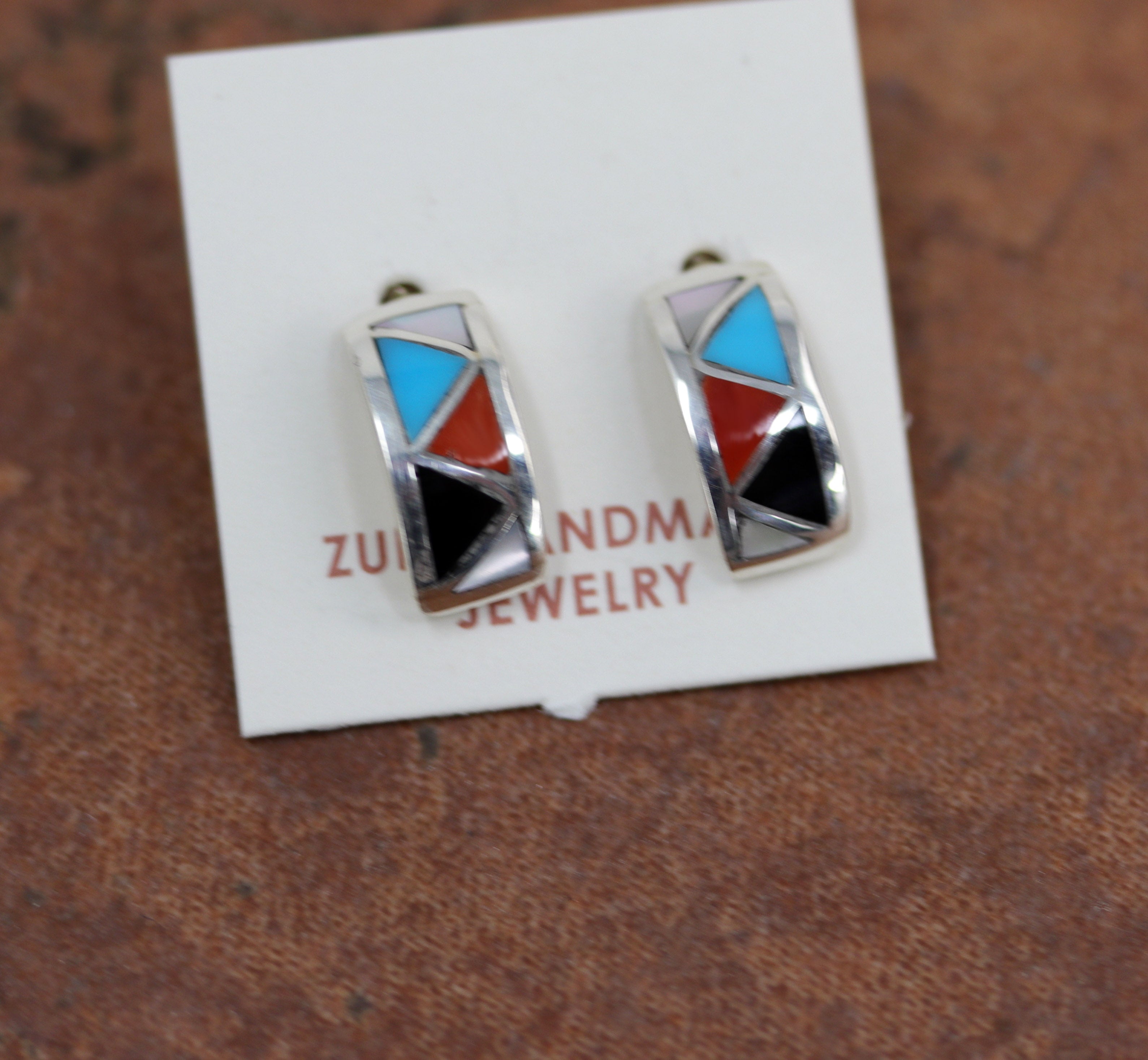 Beautiful Zuni Native American earrings. They are made from sterling silver and multi-stone inlay. Each earring is 1/2" in length, and about 1/4" in width.