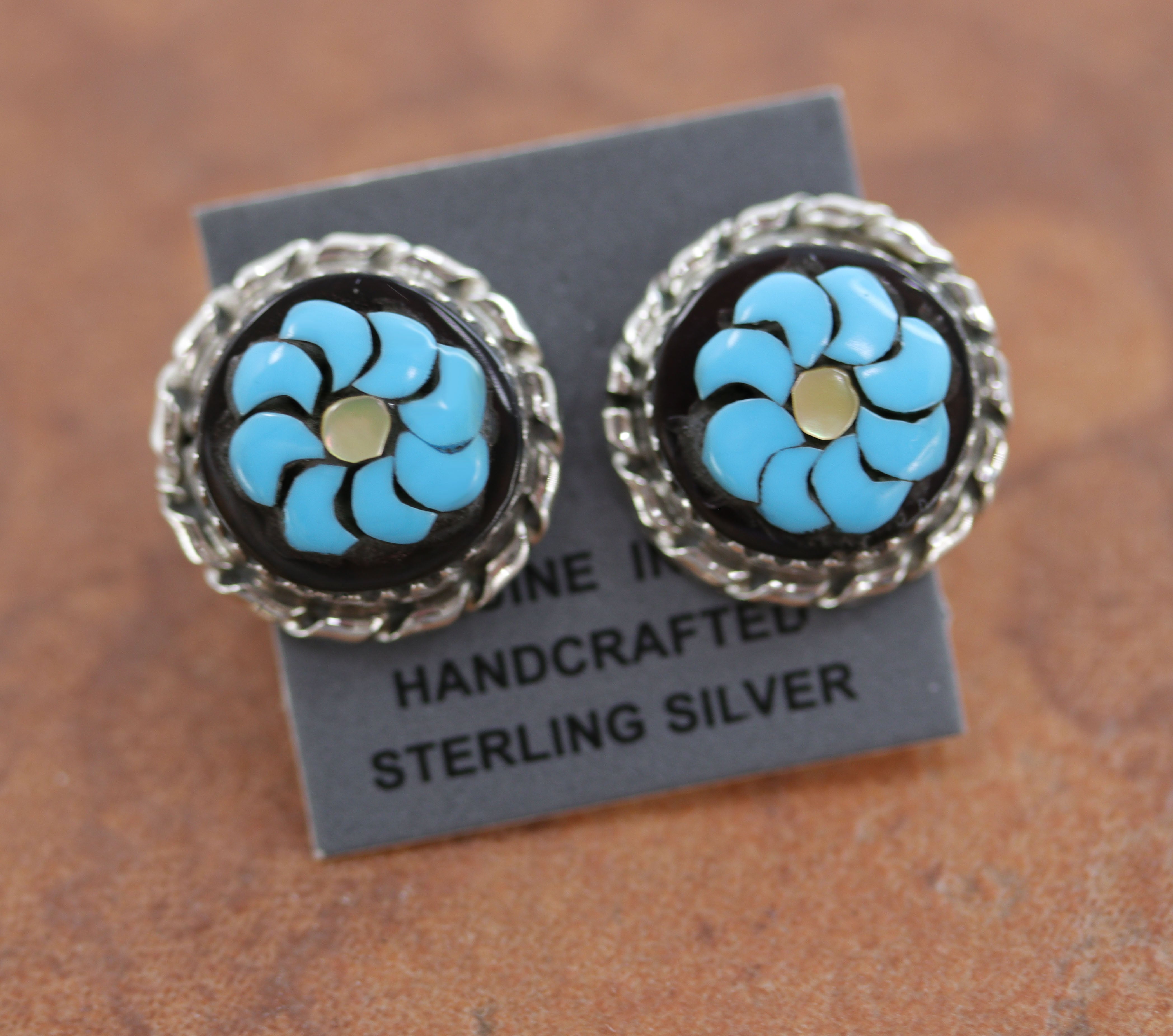 Beautiful Zuni Native American earrings. They are made from sterling silver and multi-stone inlay. Each earring is 5/8" in diameter.