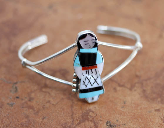 Zuni Native American bracelet made from sterling silver and multi-stone inlay. It is about 5" around and about 1 1/2" wide at the widest point.