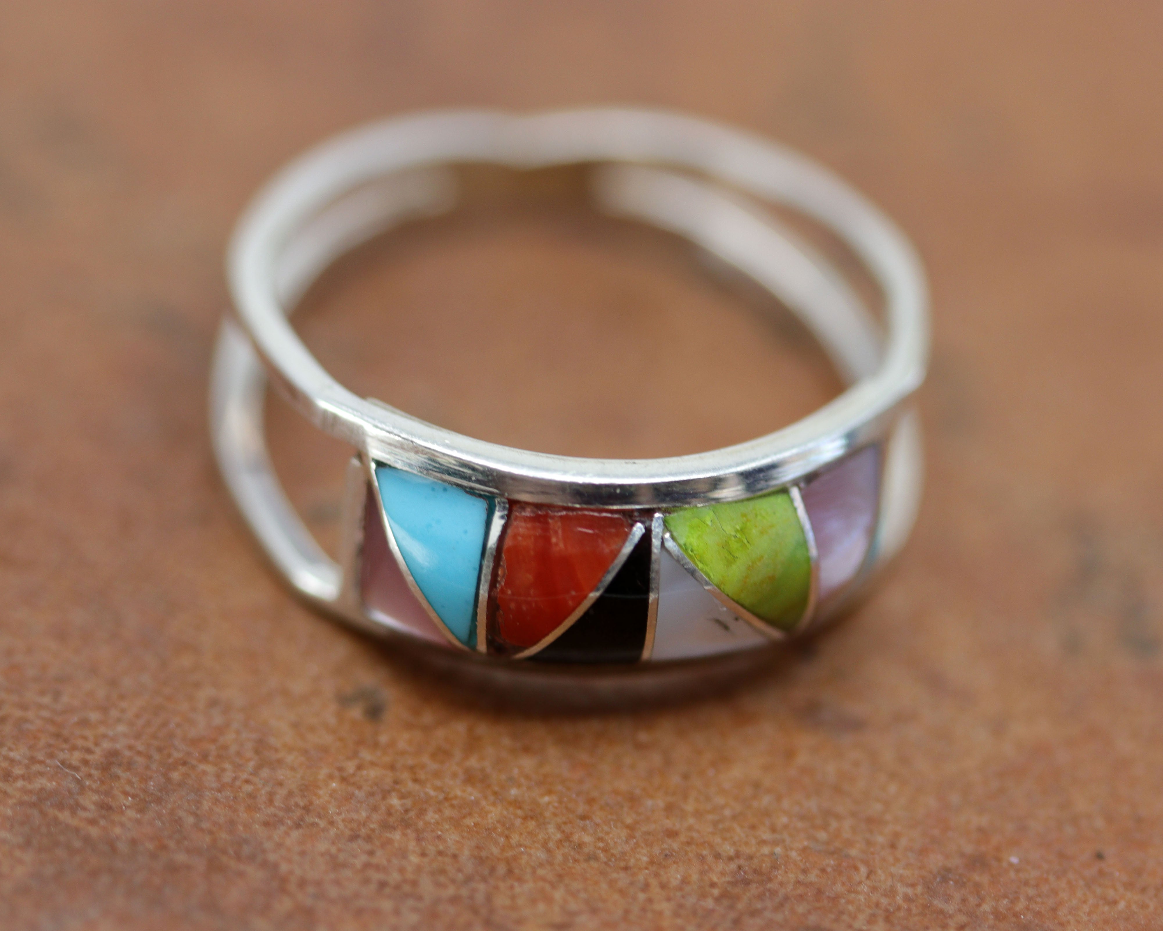 Lovely Zuni Native American ring. It is made from sterling silver and multi-stone inlay. The ring size 6 and it is 1/4" in length.