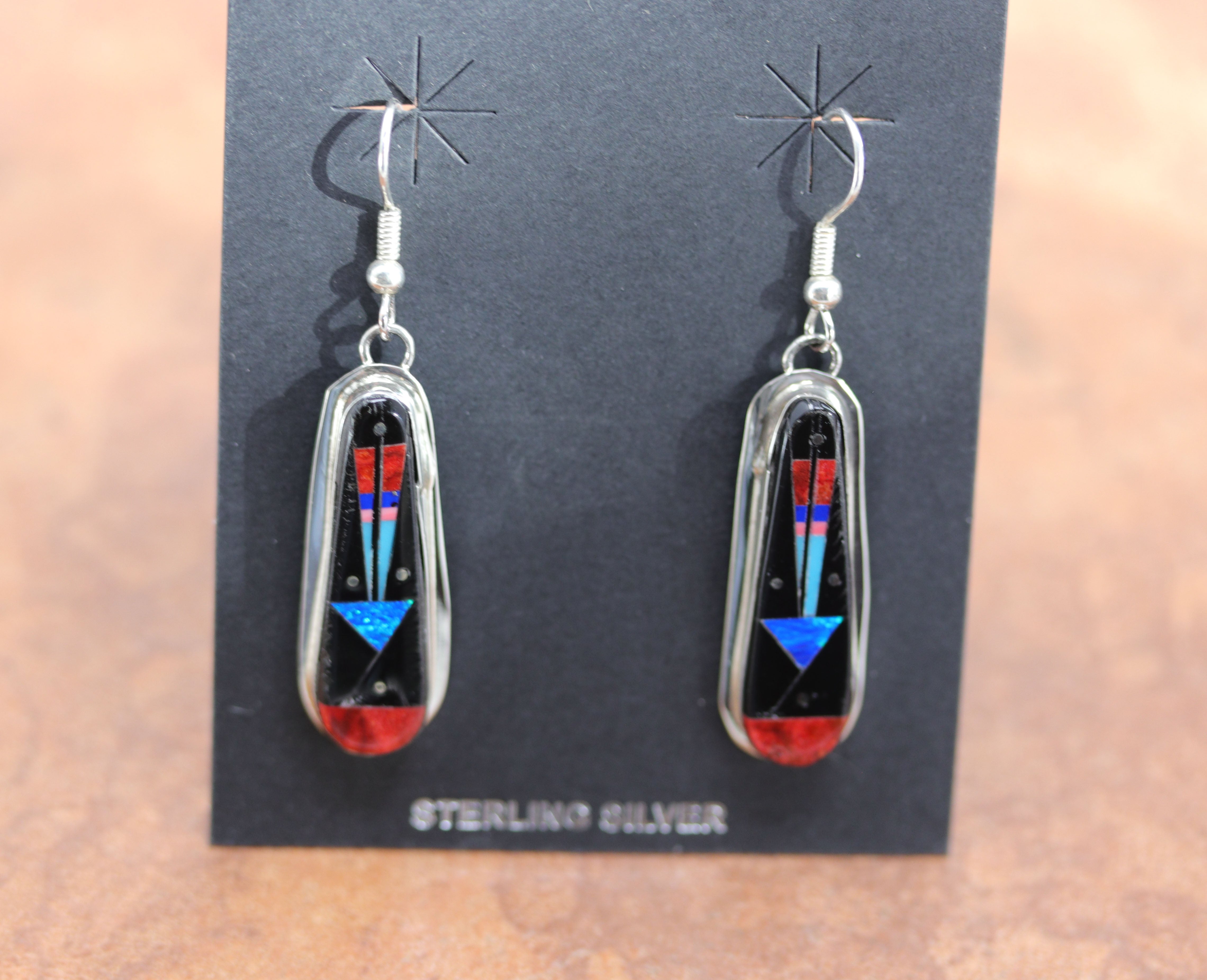 Beautiful Zuni Native American earrings. They are made from sterling silver and multi-stone inlay. Each earring is 2 1/4" in length, and about 1/2" in width.