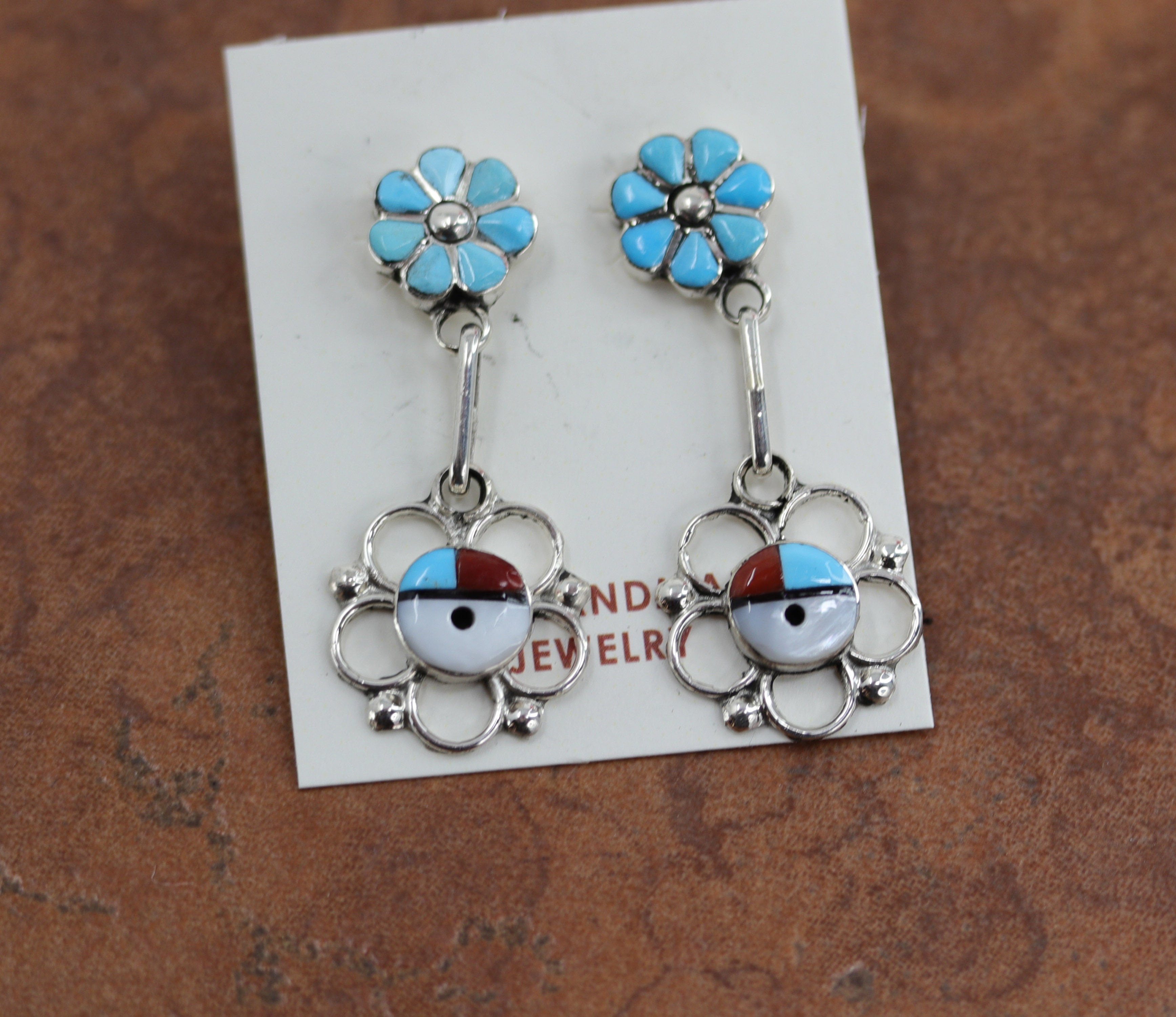 Brand new, very nice, Zuni Native American earrings. They are made from sterling silver and multi-stone inlay. The earrings are about 1 3/4" in length and 3/4" in width.
