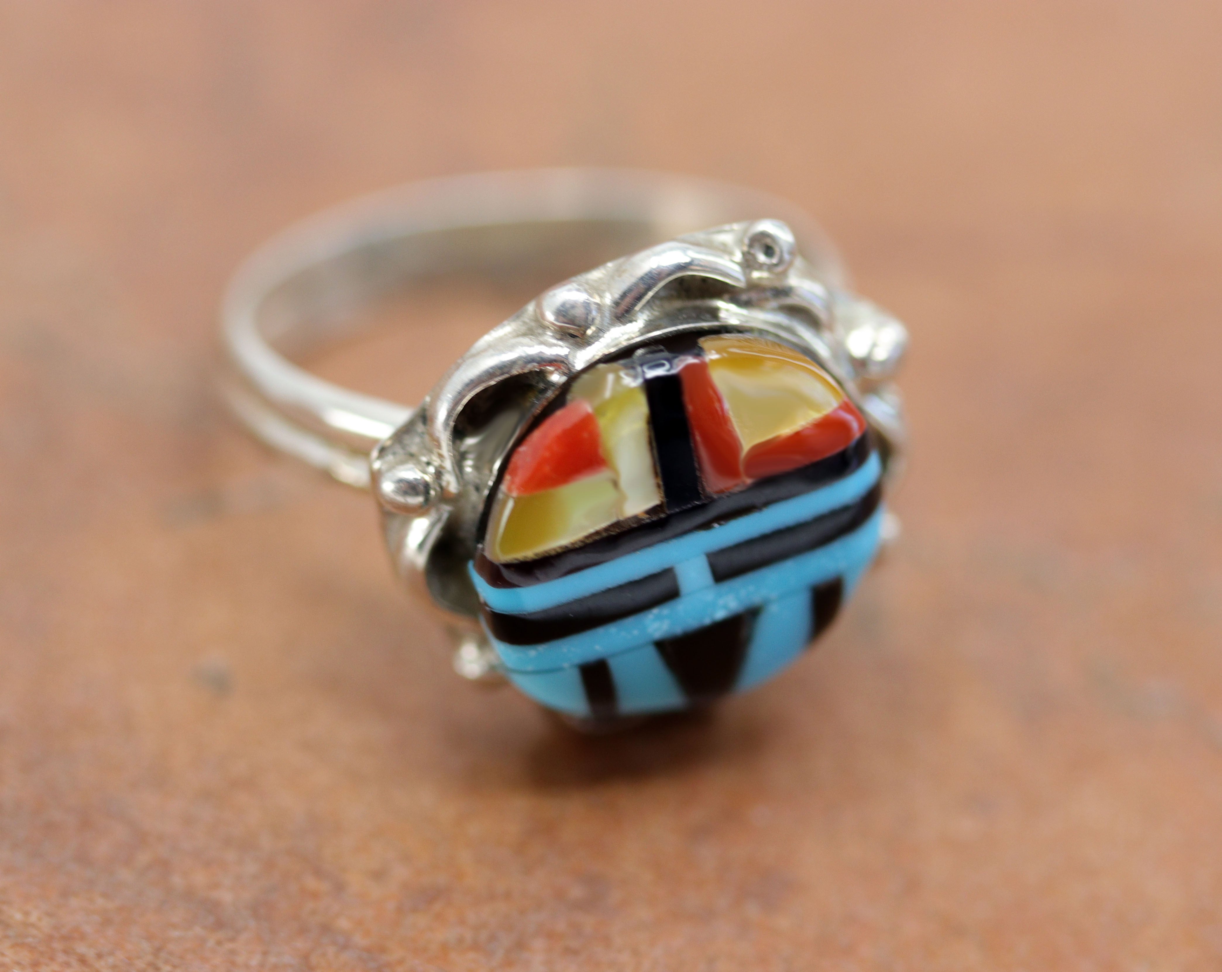 Zuni Native American ring. It is made from sterling silver and multi-stone inlay. The ring size 7 1/2 and it is 3/4" in length.