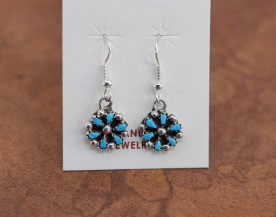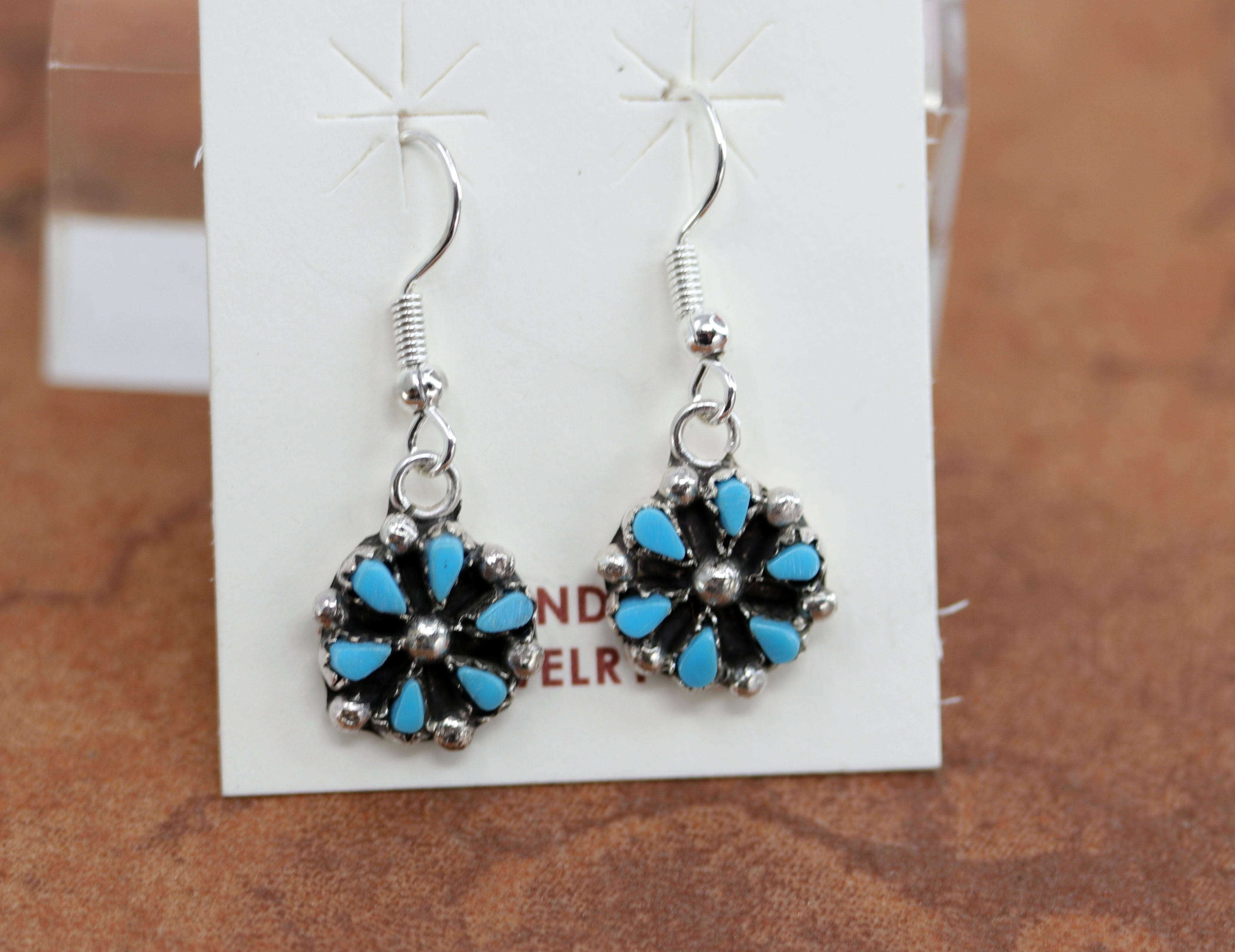 Zuni Native American earrings by Trisha Leekitty. They are made from sterling silver and turquoise. Each earring is 1 3/8" in length, and about 5/8" in width.
