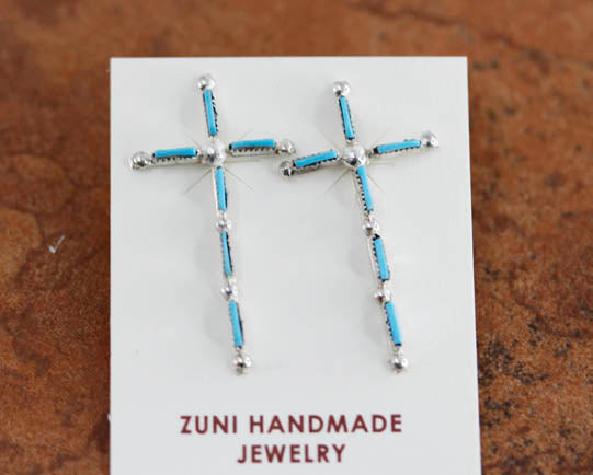 Beautiful Zuni Native American Cross earrings. They are made from sterling silver and turquoise. Each earring is 1 1/2" in length, and about 3/4" in width.