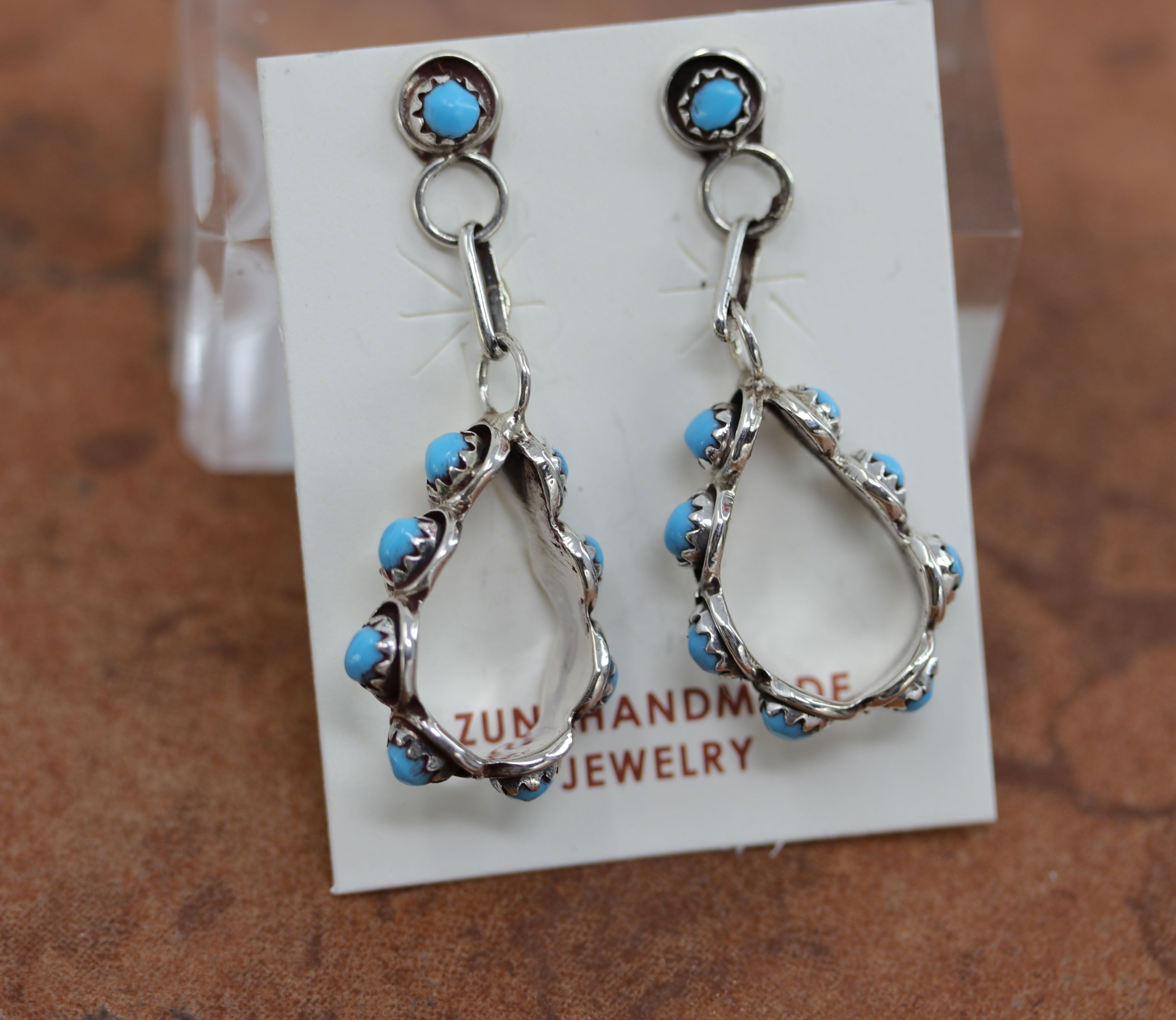 Zuni Native American earrings. They are made from sterling silver and turquoise. Each earring is 1 7/8" in length, and about 3/4" in width.