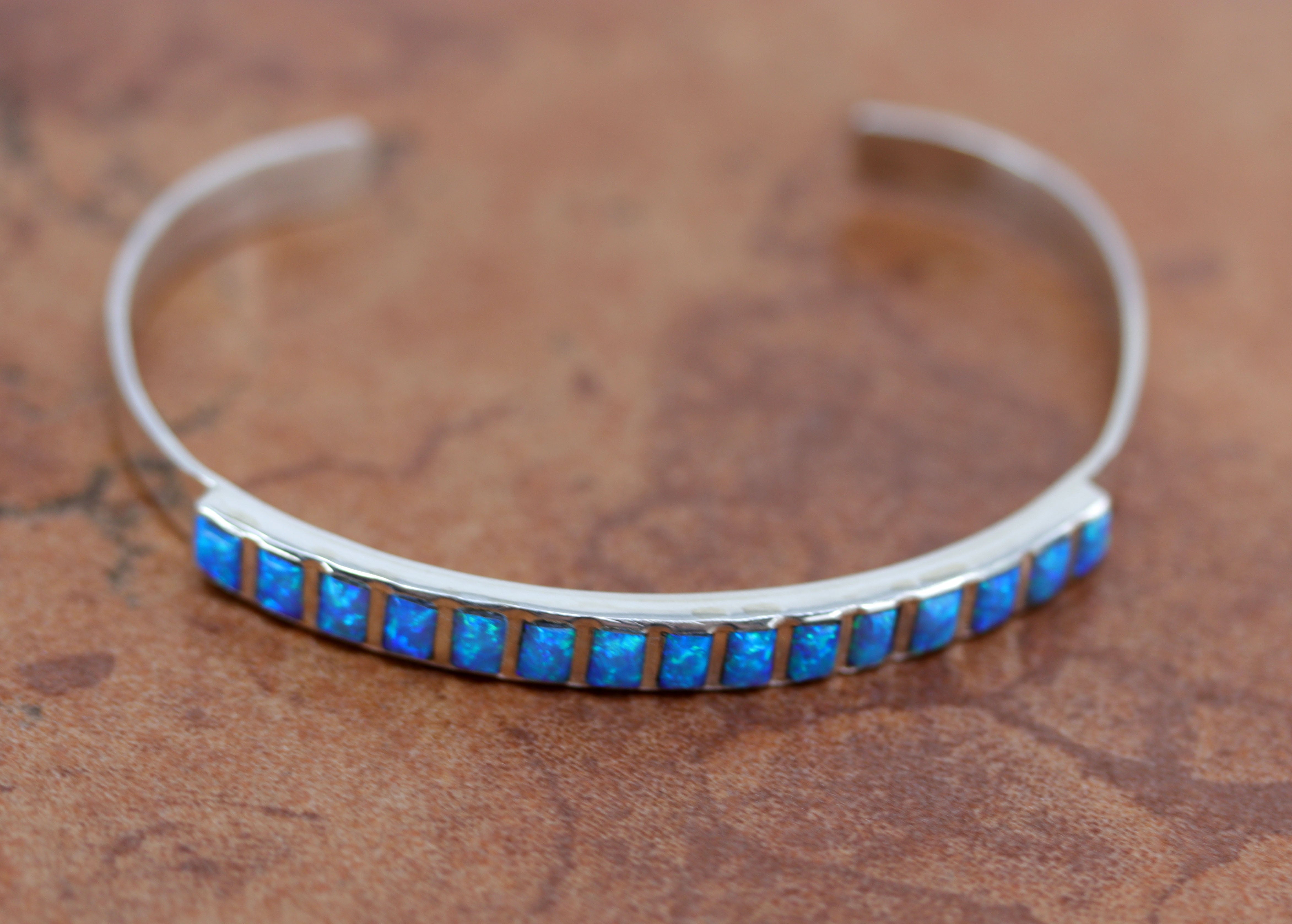 A brand new, very nice, authentic Zuni Native American bracelet. It is made from sterling silver and created opal. It is about 5 1/2" around and about 1/4" wide at the widest point. The opening is about 1 1/8" and partly flexible.