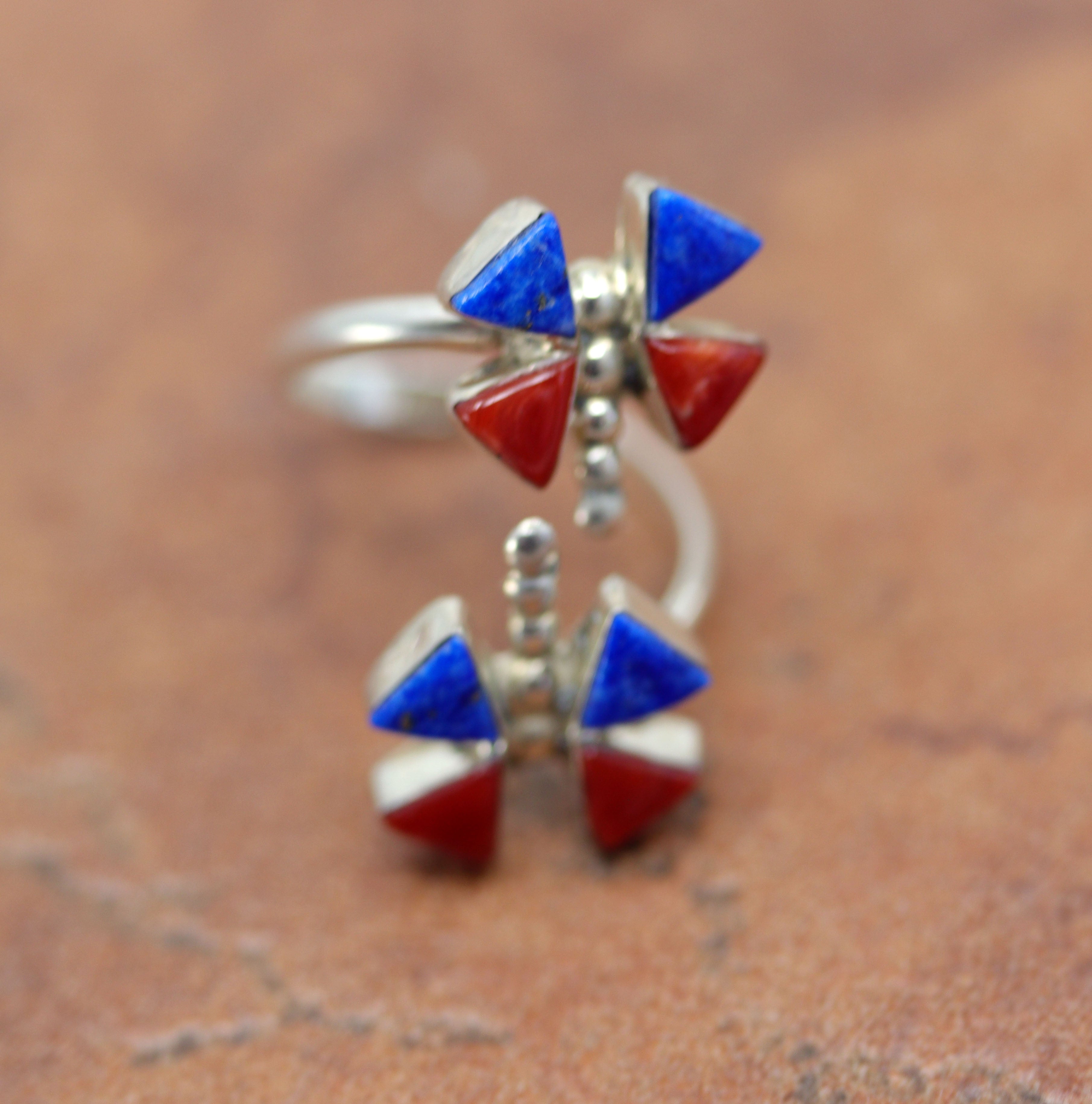 Zuni Sterling Silver Lapis Coral Dragonfly Spoon Ring Size 6-8