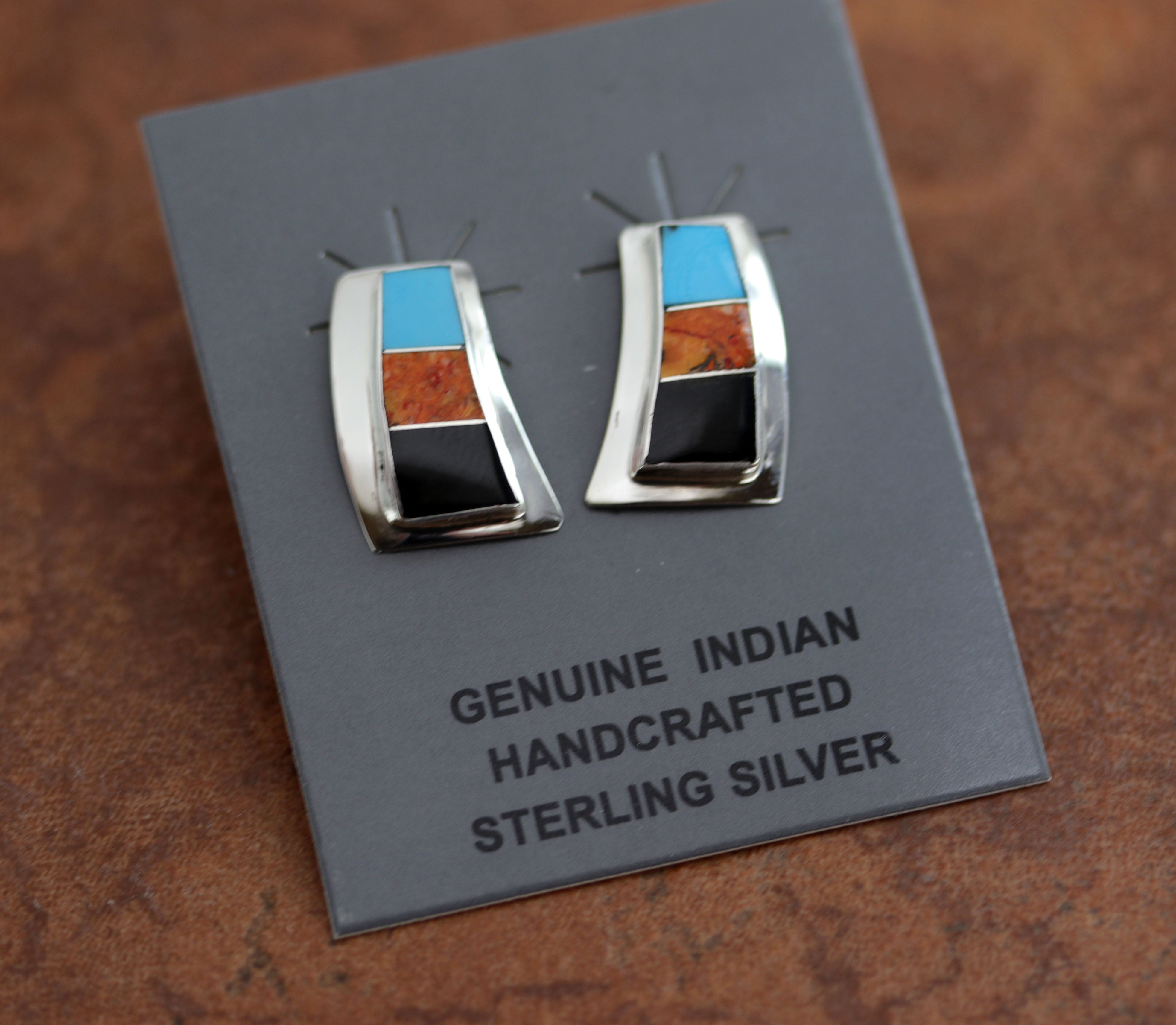 Beautiful earrings made from sterling silver, coral, turquoise, and onyx. Each earring measures about 7/8" in length and 1/2" in width.