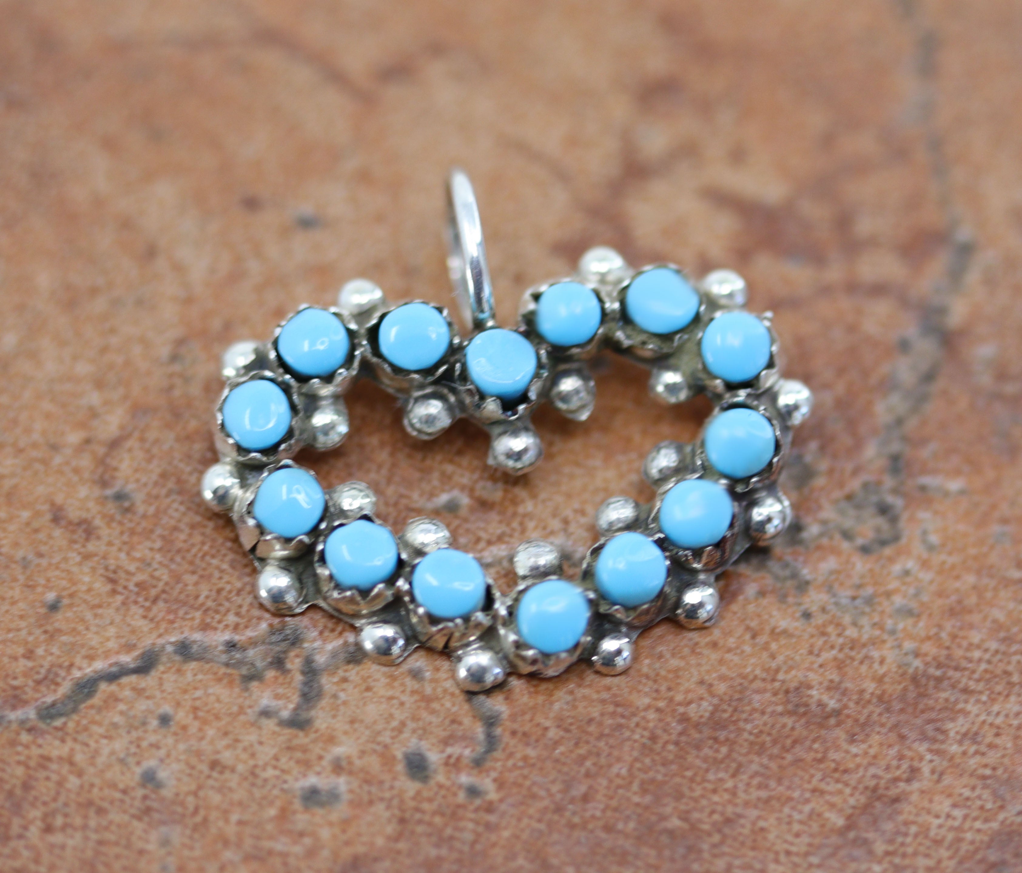 A beautiful Zuni Native American Pendant. It is made from sterling silver and turquoise. The pendant is about 1" in length and about 1" in width.