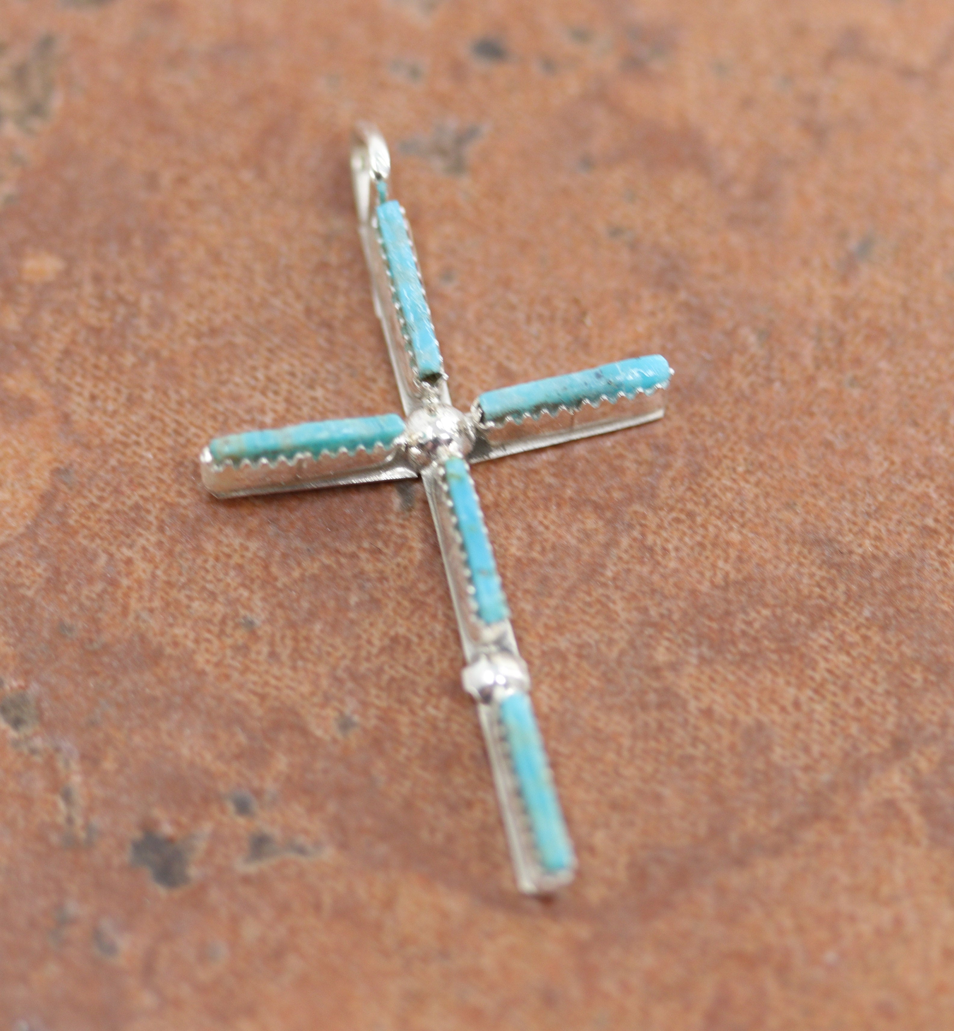 An authentic Zuni Native American Pendant. It is made from Sterling Silver and turquoise. It is about 1 1/2" in length including the bail, and about 7/8" in width.